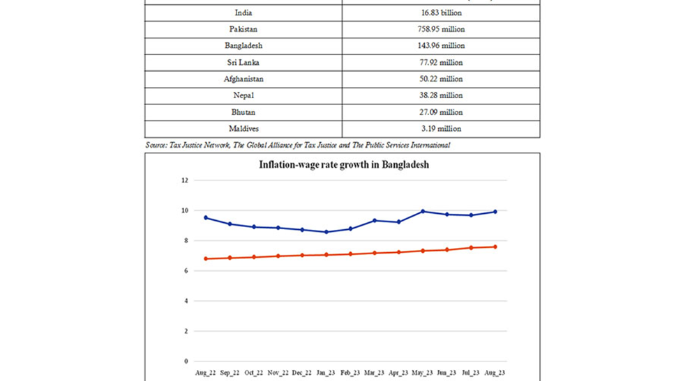 Regular people are the ones who suffer since their purchasing power has drastically decreased due to their earnings not in keeping with the inflation rate. The Bangladesh Bureau of Statistics data indicates that the past 12 months' pay growth has lagged behind the inflation rate. The horizontal axis shows data corresponding to each month, starting from August of 2022 until August of 2023. The vertical axis represents the value in percentages of the change in Bangladesh's inflation and wage rate growth rate. The middleclass grapples with a tax system that disproportionately burdens those least able to bear it.